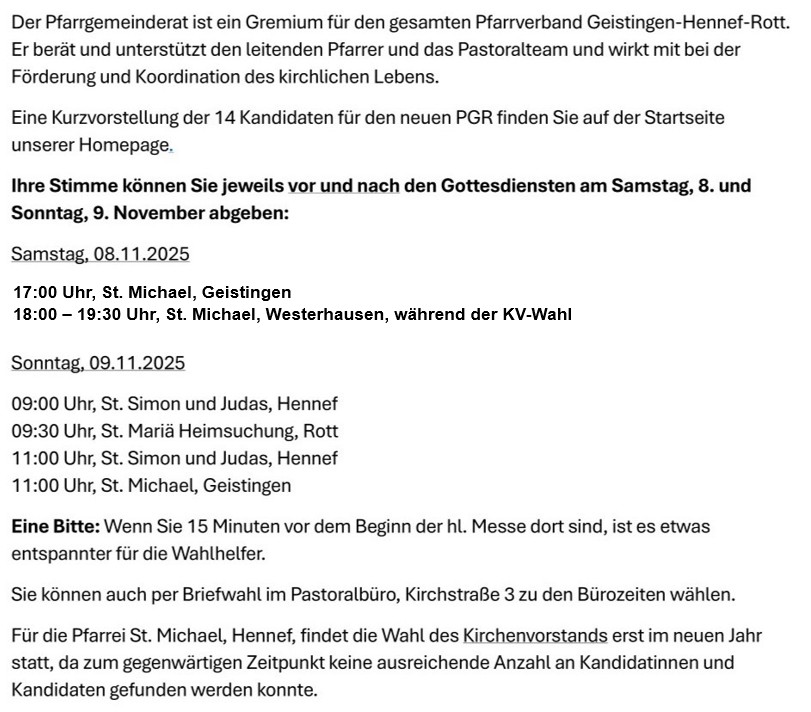 Am 08. und 09. November finden im ganzen Erzbistum die Wahlen der Pfarrgemeinderäte und der Kirchenvorstände statt.